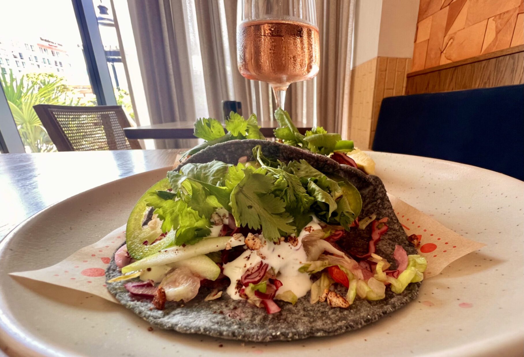 Taco de batata doce e verduras frescas é opção vegeatariana do rooftop Wax Myrtle’s – Andrea Miramontes/ instagram @ladobviagem