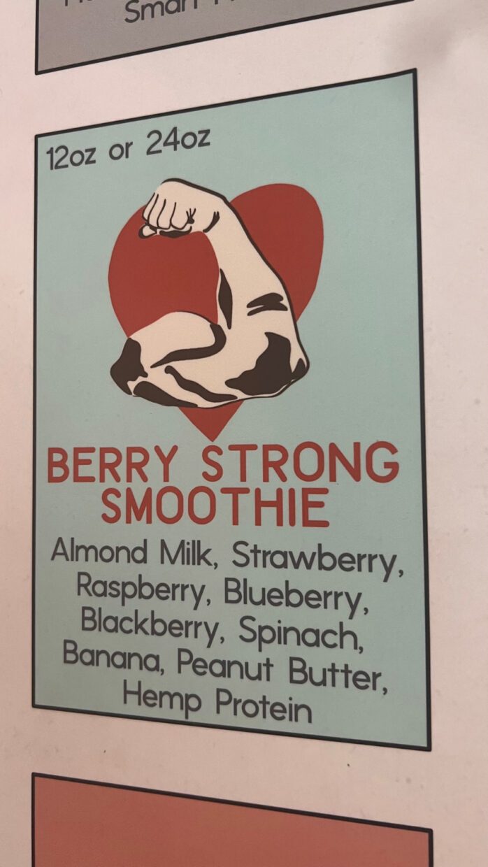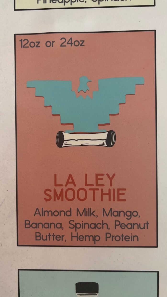 Provei o vegano “La Ley Smoothie”, com leite de amêndoas, manga, banana, espinafre, pasta de amendoim e proteína de canábis.