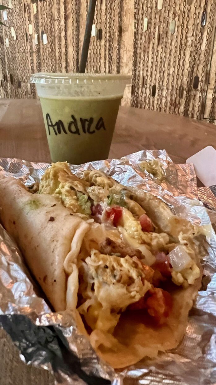 Entre as opções vegetarianas, tacos quesadillas, guacamole, além de vários smoothies para acompanhar.