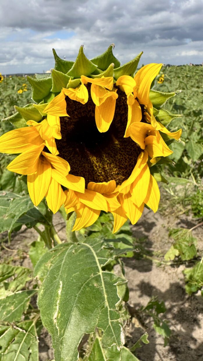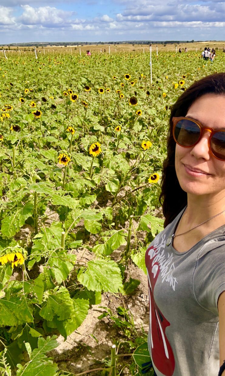 Nessa época, os campos de girassóis estavam cheios de flores. Há imensas tesouras por lá para que o visitante leve uma (ou mais) flor para casa.