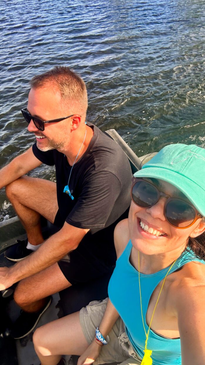 Diego Berlitz e eu (Andrea Miramontes) durante passeio de Mucky Duck, carro anfíbio, que anda na terra e na água – Foto @ladobviagem