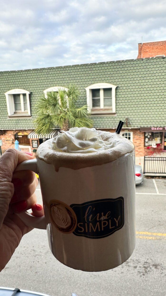A cidade histórica é linda, com uma rua principal cheia de bares, lojinhas e cafés autênticos, como o One Flight Up Cafe, uma das cafeterias mais conhecidas de Mount Dora.