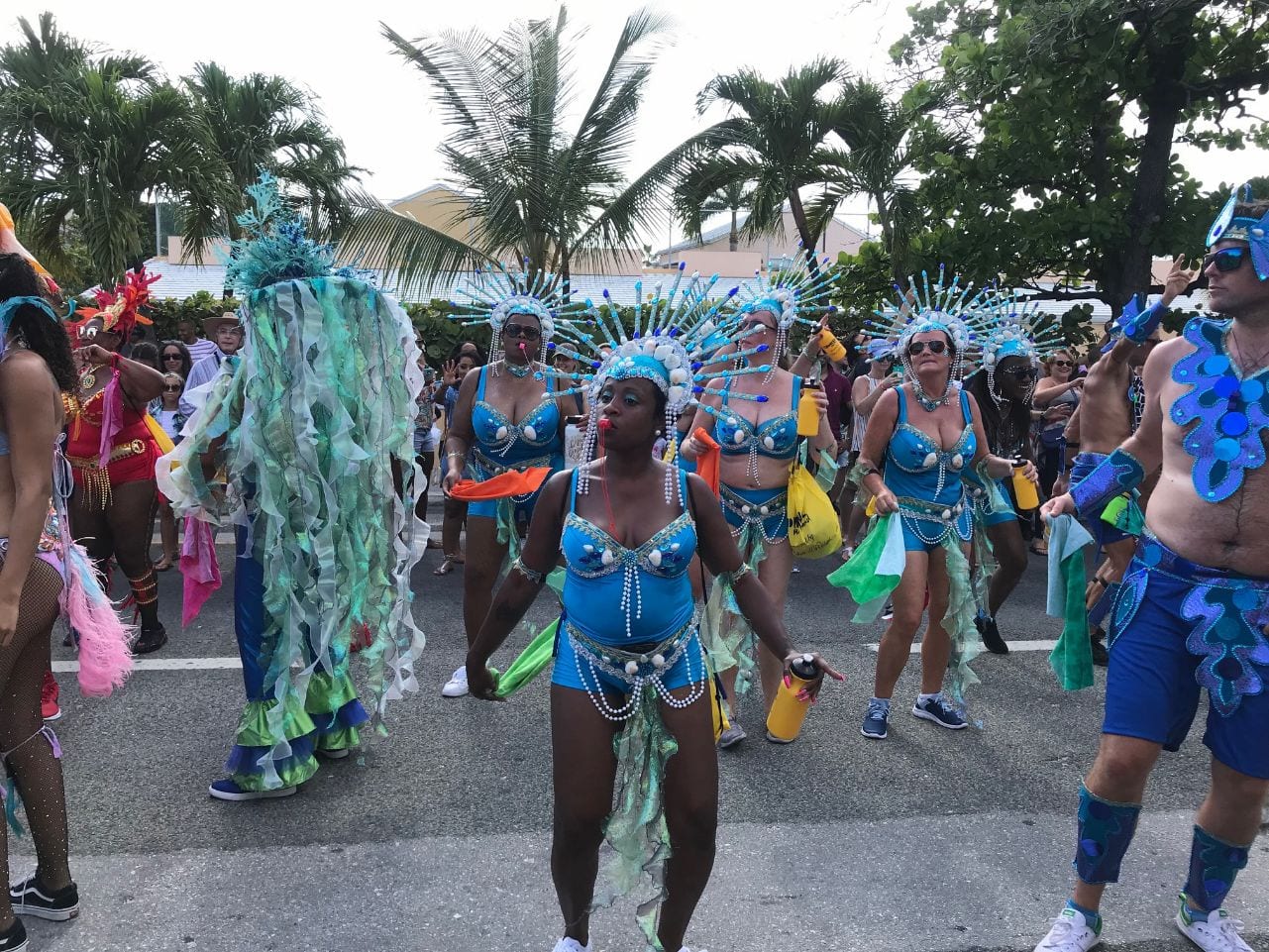 Mas no dia do Carnaval, a balada é na rua. É comum encontrar foliões fantasiados e cheios de lantejoulas na maquiagem por todos os cantos na Grand Cayman, antes e depois dos desfiles.