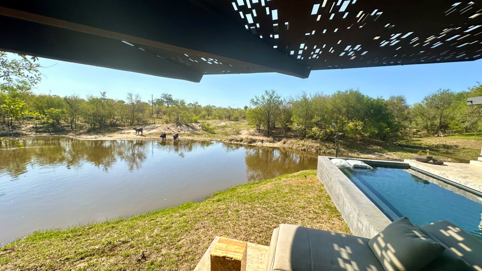 Piscina de uma das vilas, de onde podemos observar elefantes, hipopótamos e búfalos na savana