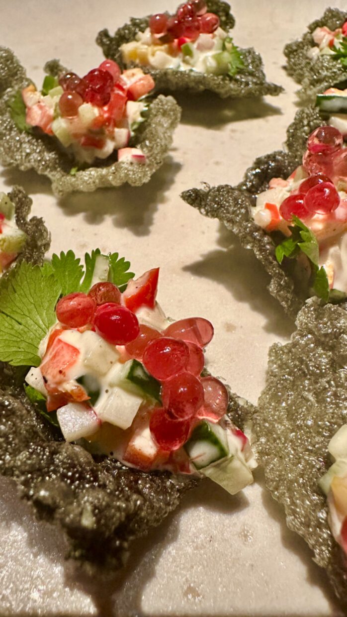 Várias delícias foram servidas. Destaco o gaspacho de tomate e o gin com infusão de clitória, acima, uma flor que lembra exatamente o que você pensou.