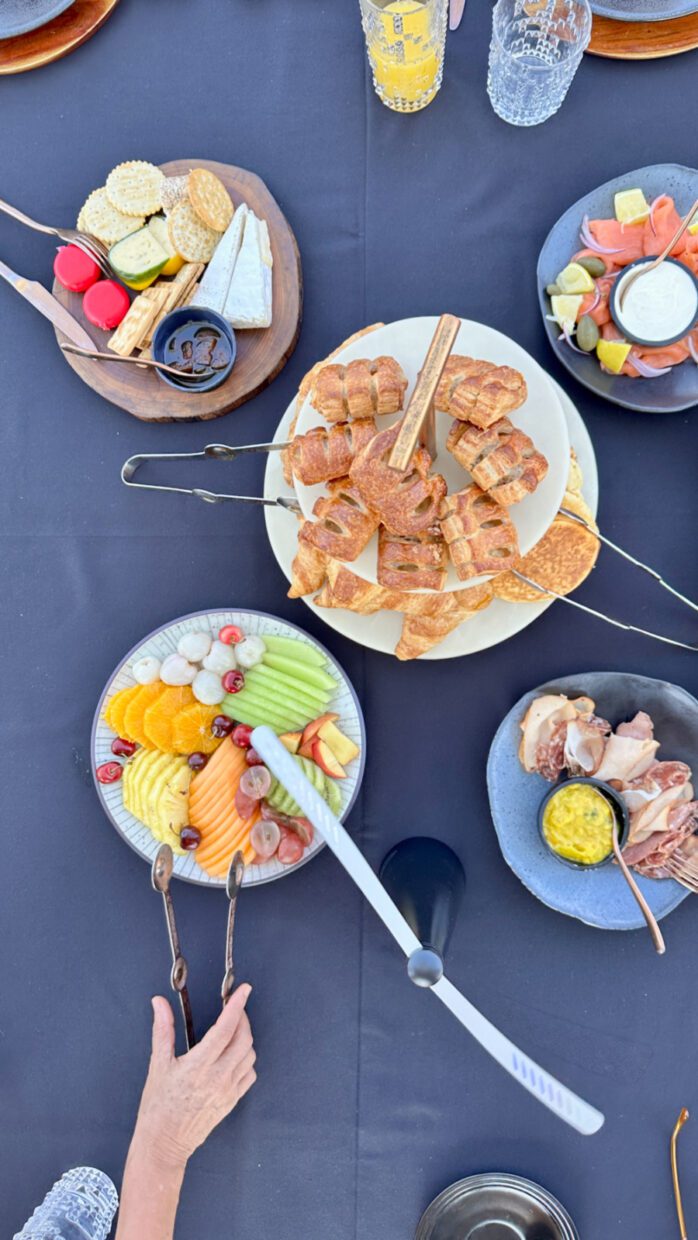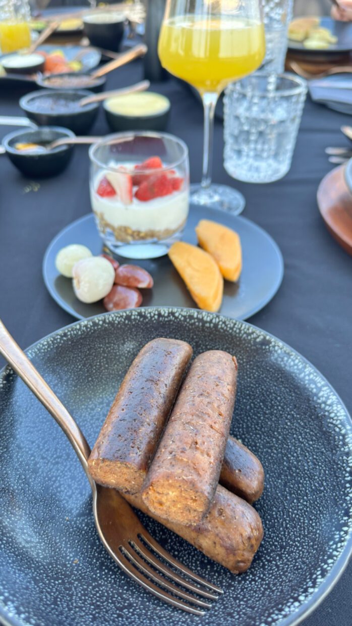 O café da manhã também pode acontecer na savana. A mesa montada pela equipe, com mimosa, frutas, croissants e linguiça vegetal, foi impecável.