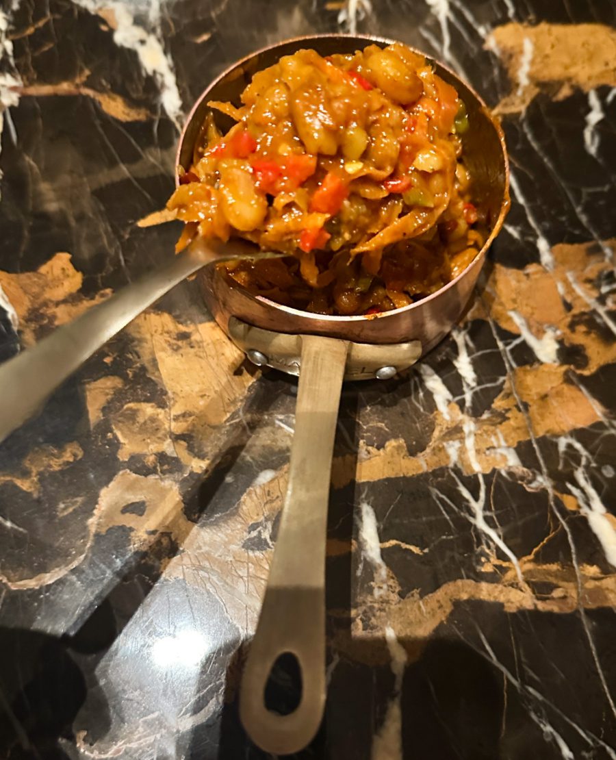 Entre os diversos pratos vegetarianos e veganos, o chef preparou uma linguiça vegetal, que estava perfeita, e o chakalaka, creme de feijão tradicional apimentado, na foto abaixo, da panelinha.