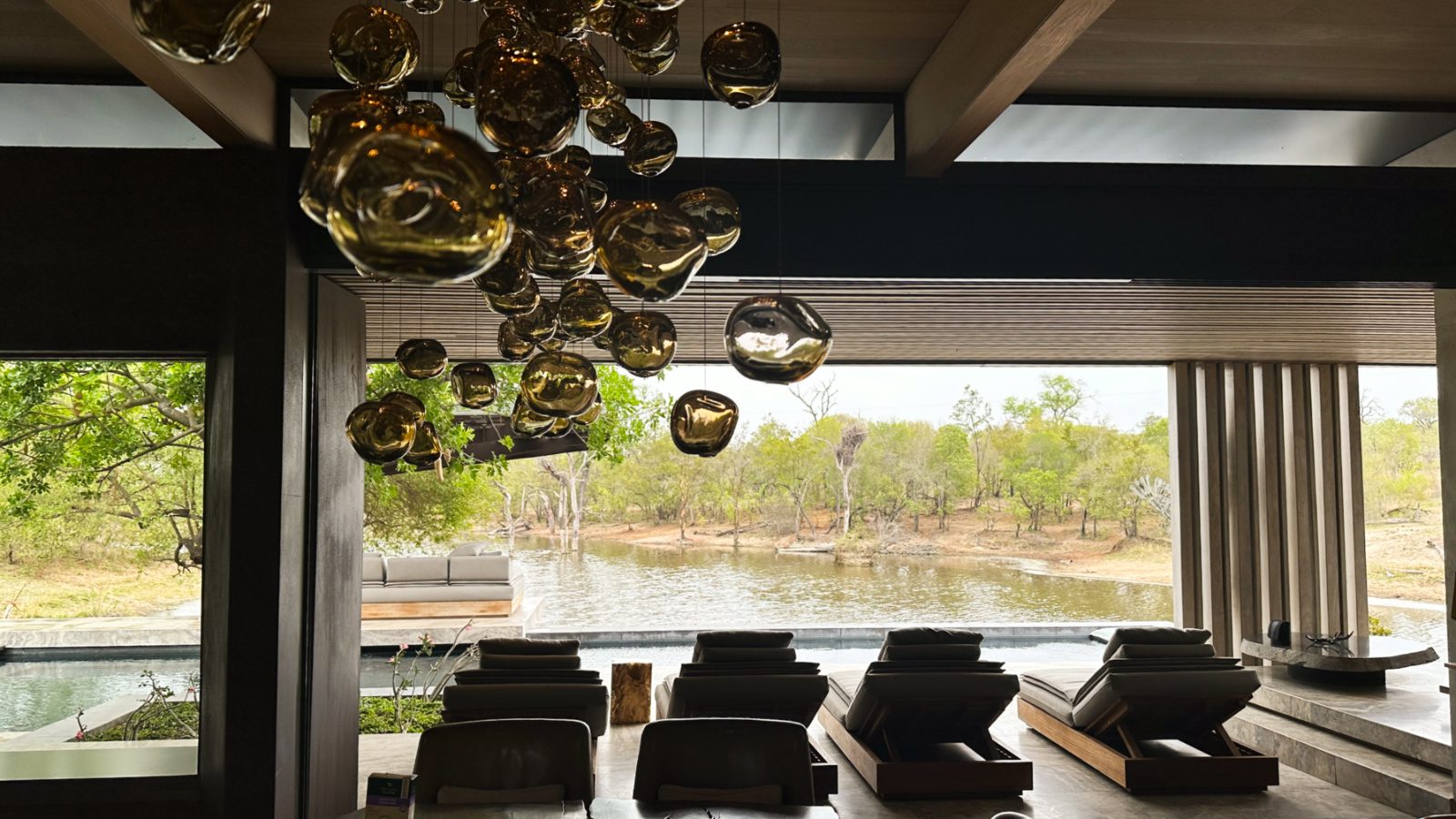 Da minha varanda, ou de dentro do quarto com as portas de vidro, cervos, búfalos e hipopótamos aproveitavam o rio selvagem da reserva Sabi Sand.