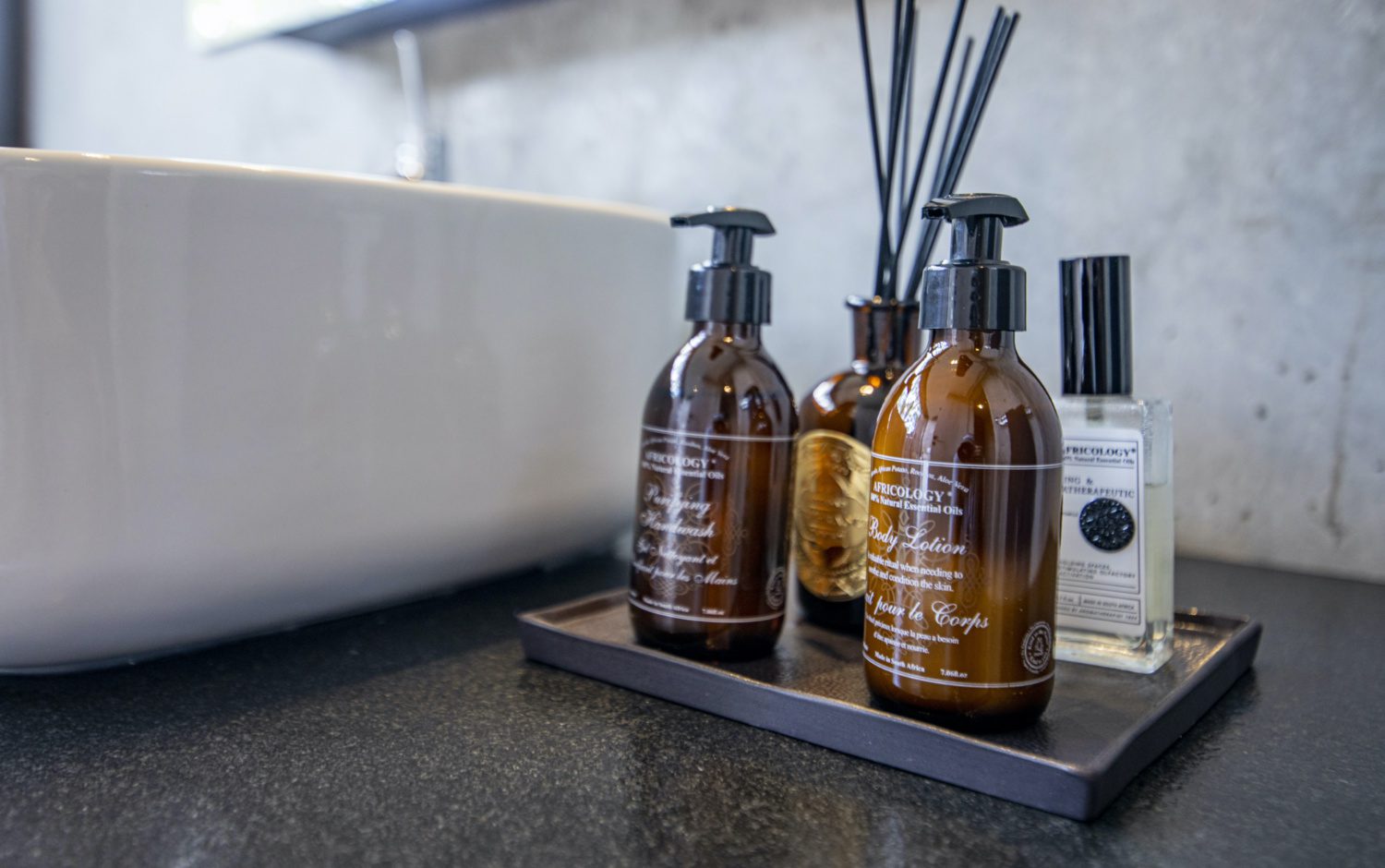 Os produtos de banho e beleza são da grife local Africology, que usa ingredientes naturais africanos e é cruelty free, ou seja, nunca testados em animais.
