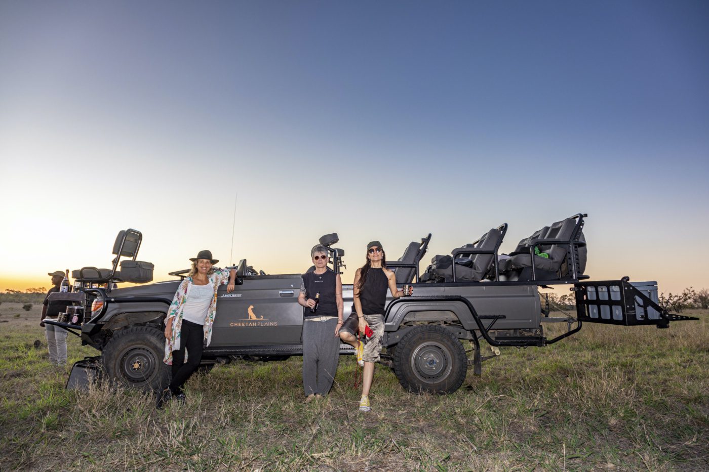 Milly Lacombe e Tati Isler durante pôr do sol na savana, no safári Cheetah Plains – foto Andrea Miramontes @ladobviagem