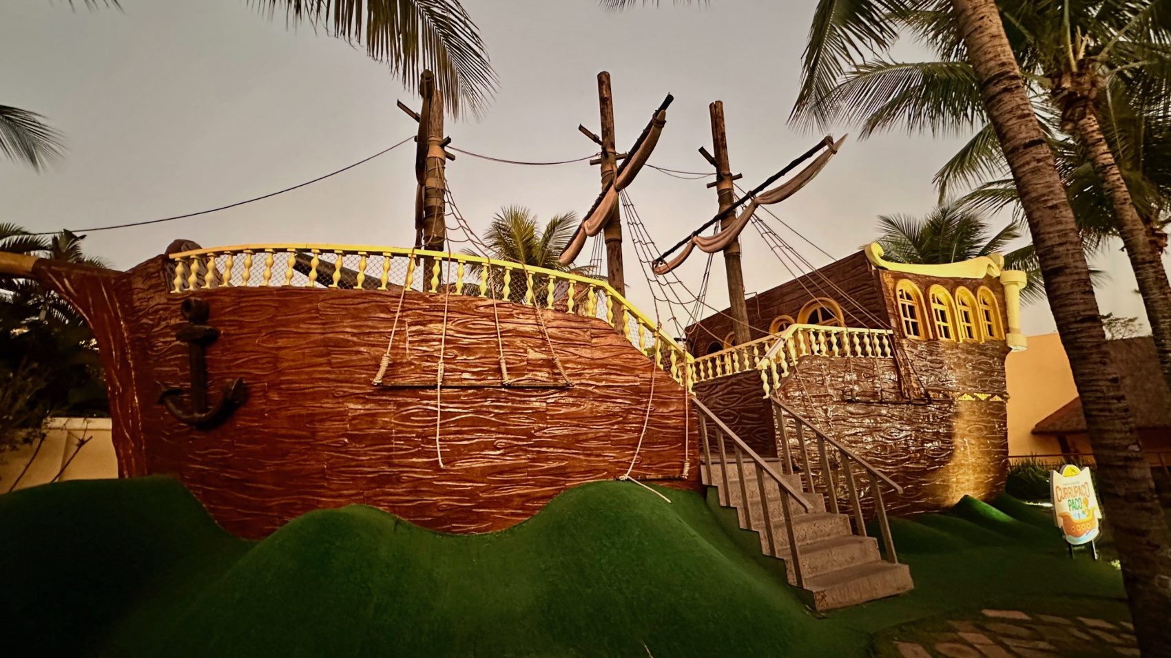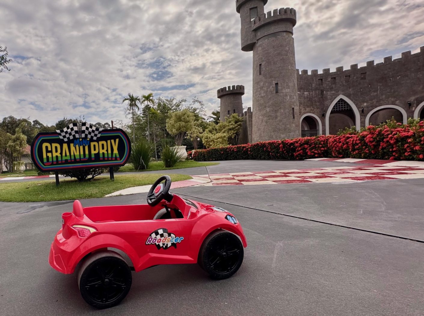 O que mais impressiona é o jardim lindíssimo, onde está localizada a área infantil. Além de um barco pirata, há casa de bonecas (chamada de casa da coelha dona Fofa), pista de kart, espaços para jogos e até um castelo.
