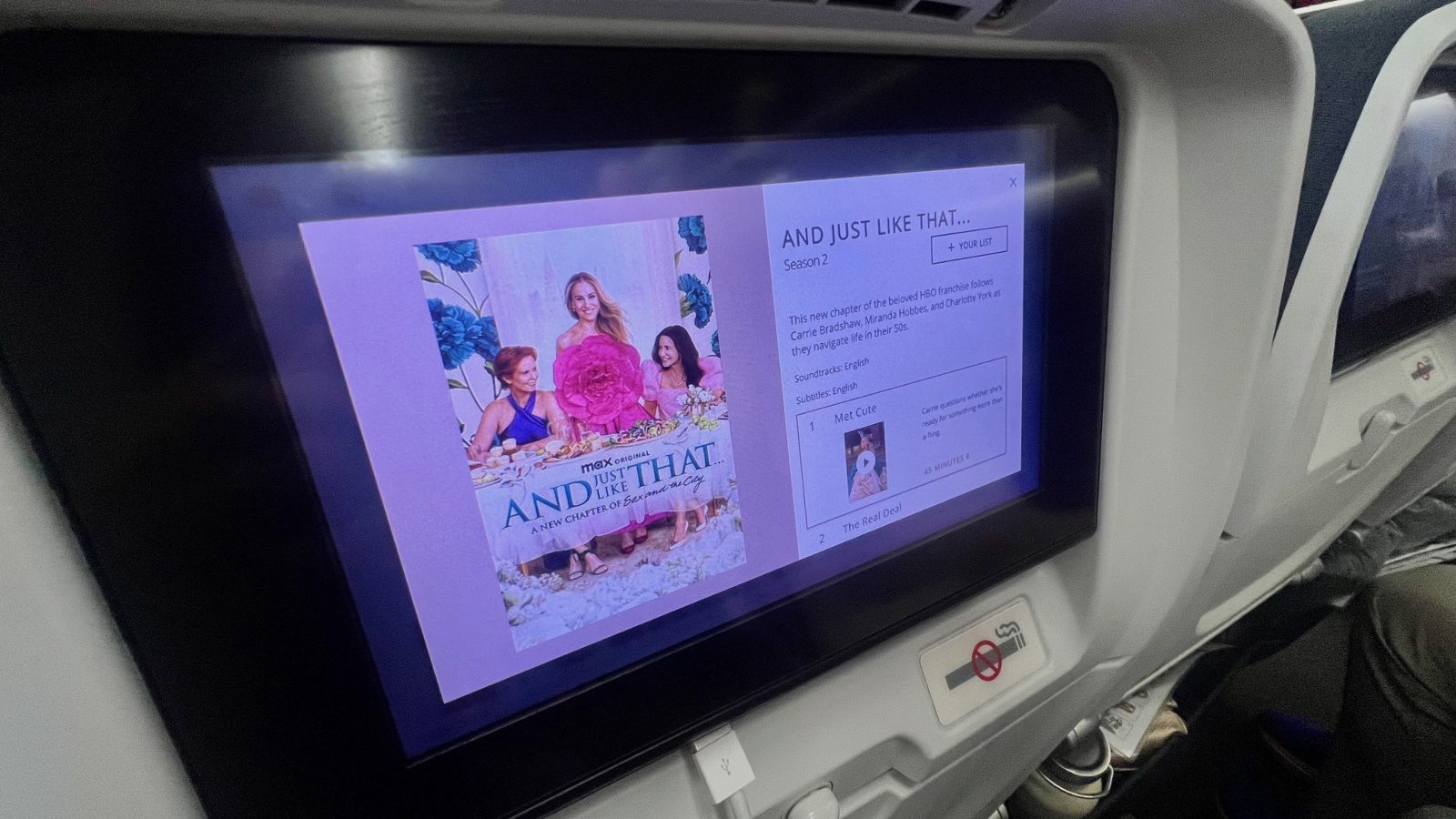 Mesmo na econômica, todas as poltronas têm TVs individuais, com filmes e séries que amo, o que era muito comum no passado mas hoje muitas aéreas não disponibilizam mais. Também é servido vinho durante as refeições.