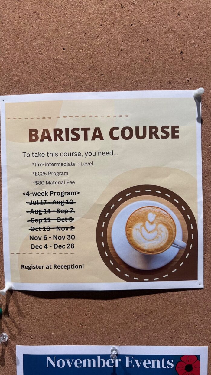 Durante a tarde, os cursos são complementares, e você aprende idioma de uma diferente, como no curso de barista ou de como falar em público (public speaking).