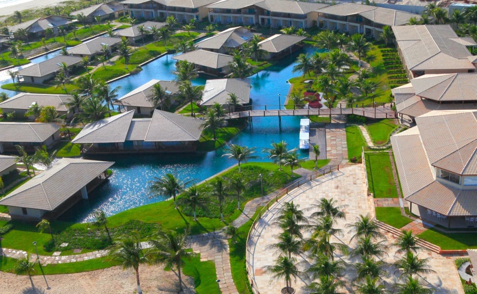 Quartos são rodeados por uma lagoa navegável que conecta tudo. É no hotel também que está o Aquiraz Riviera Golfe Course, o primeiro e único campo de golfe do Nordeste.