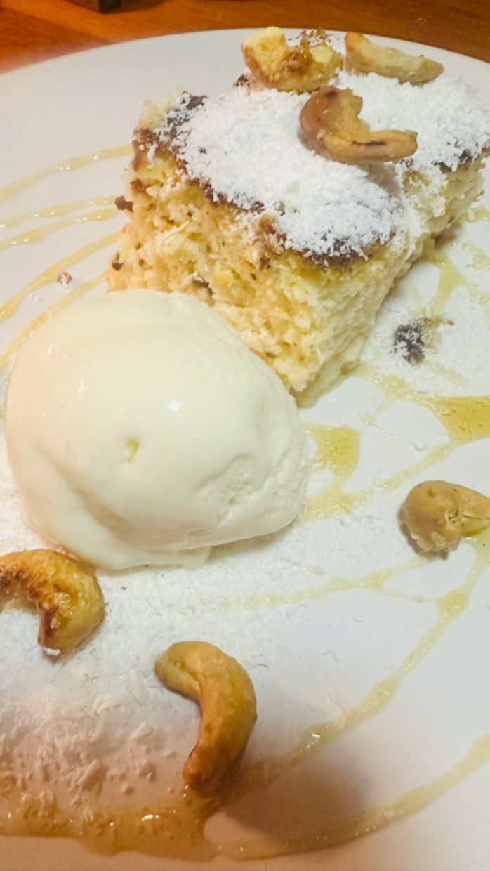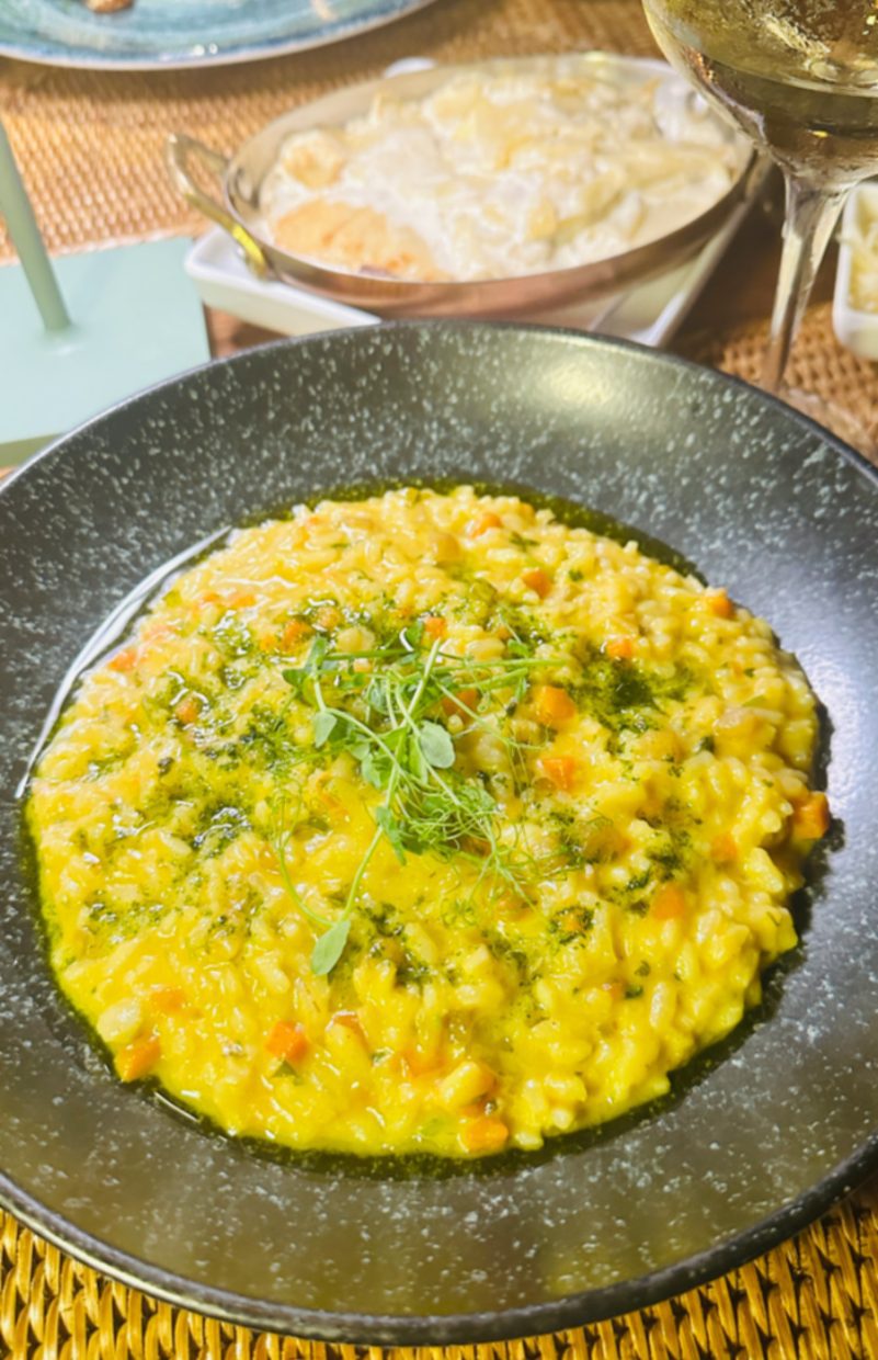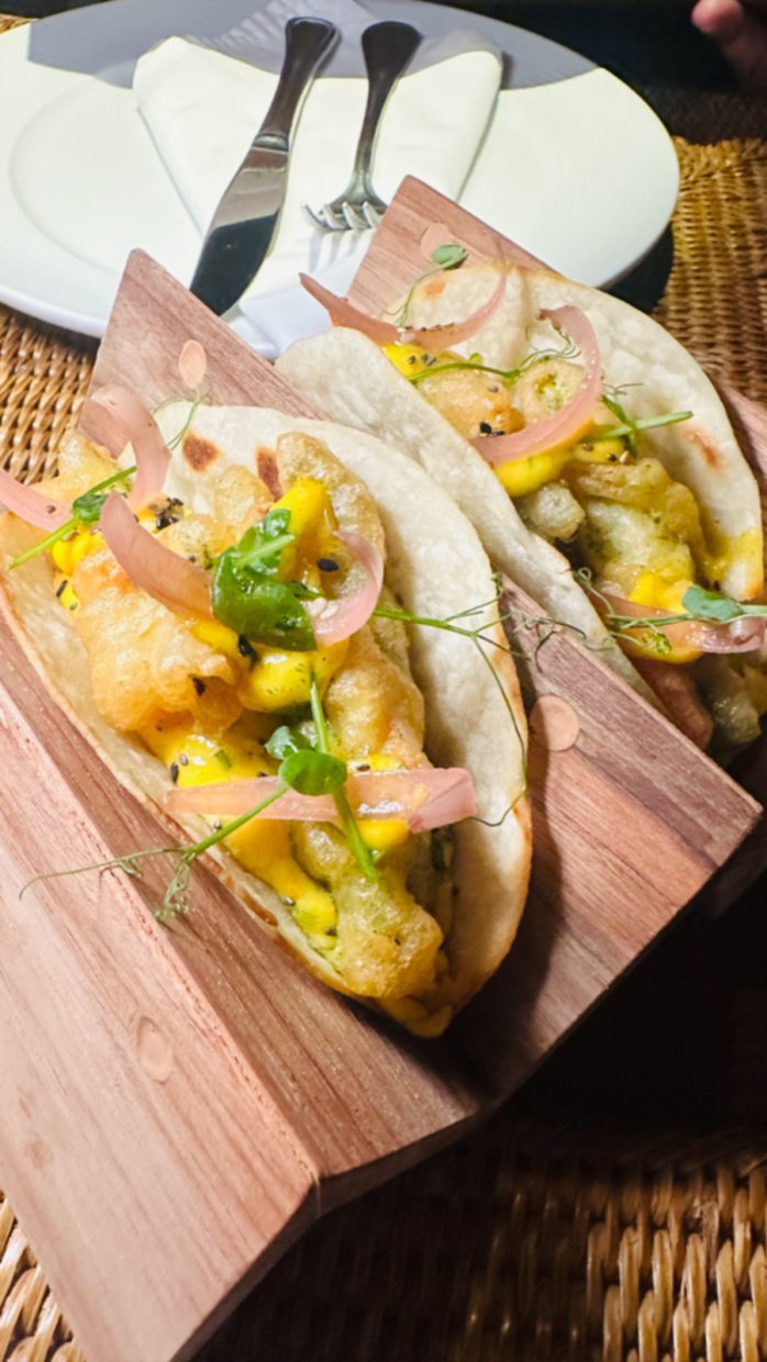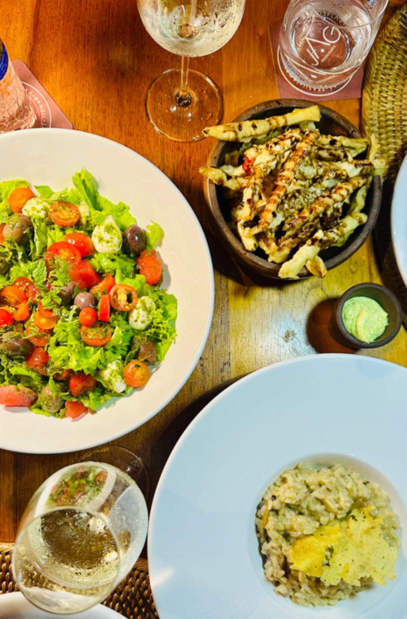 Dentro do hotel, o Restaurante Vila Selvagem preparou um menu especialmente vegano para mim, que estava perfeito. Provei o risoto de legumes e os tacos de legumes com maionese de pimenta. Para sobremesa um mousse de chocolate levíssimo.