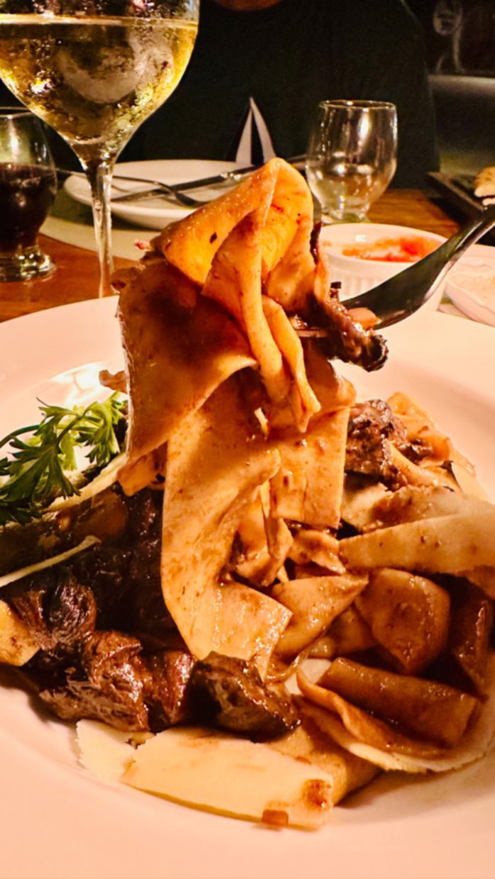 Provei um parppadelle ao funghi, além de uma sobremesa inesquecível, o pavê de limoncello, o delicioso licor italiano de limão.