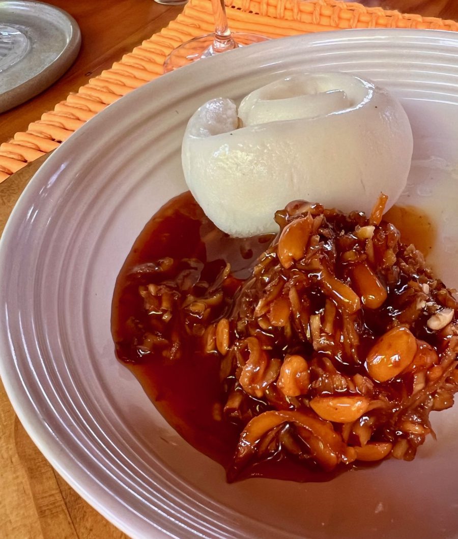 Menu varia conforme a refeição. Acima, jantar com raviolli; bebidas alcoólicas são servidas à vontade – foto Andrea Miramontes / @ladobviagem
