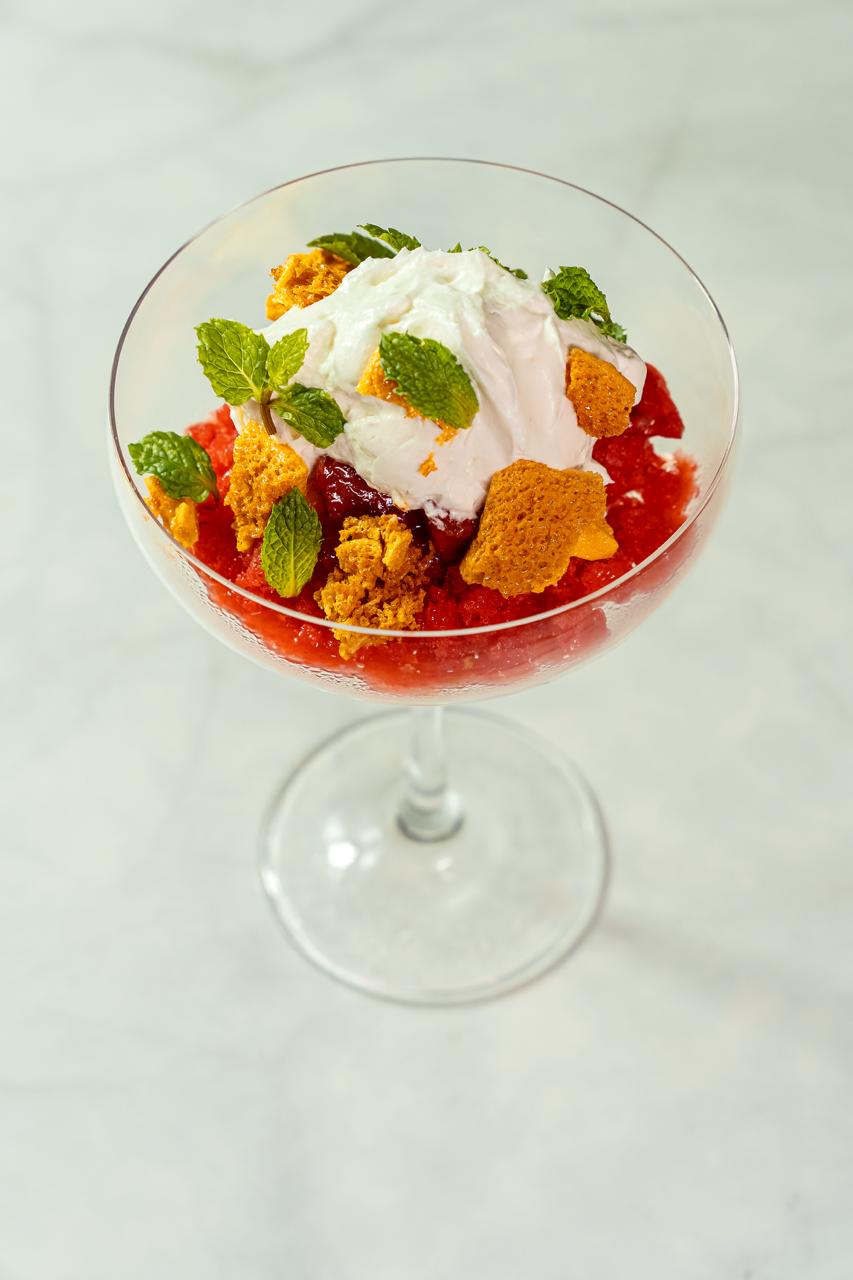 Morango Marinado com capim santo, tangerina, granita de morango, honey comb, chantilly e hortelã – Andrea Miramontes / @ladobviagem