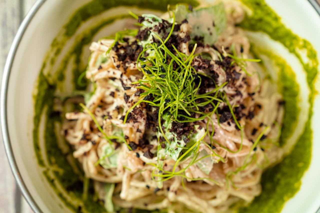 “Temos diversas opções veggie style como nosso Cacio e Pepe (tradicional pasta italiana), uma massa de feijão sem trigo, com creme aveludado de castanhas de caju, azeitonas e brotos, um clássico da nossa cozinha e que por ser servido frio”, diz.