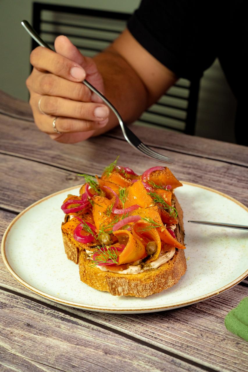 Tostada lox: Salmão de cenoura, cream cheese, alcaparra, dill (tempero) picles de cebola roxa e pó de nori (algas marinhas) – Andrea Miramontes / @ladobviagem