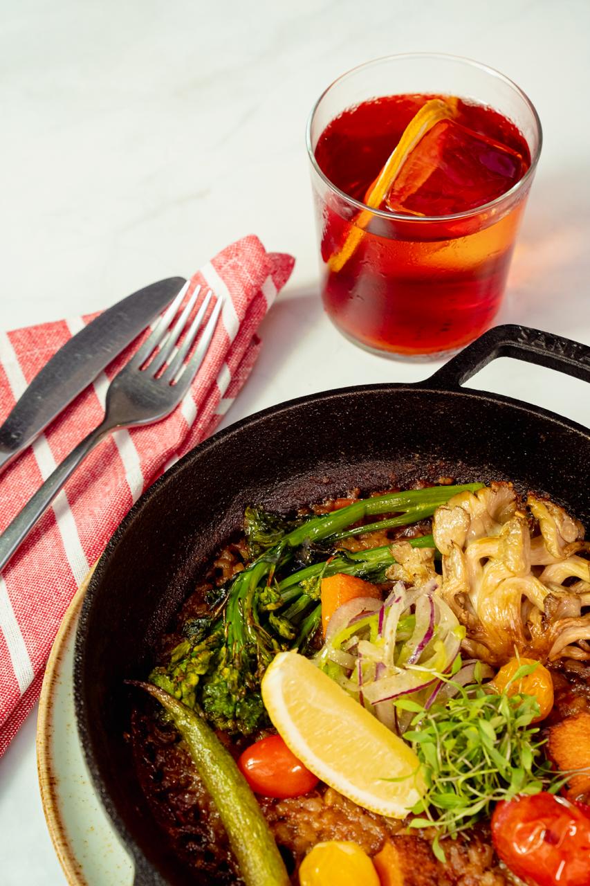 Como prato principal, vá de bowl proteico de grão de bico e legumes assados, com a linguiça de pimenta biquinho, feita com proteína de ervilha e envolta em alga.