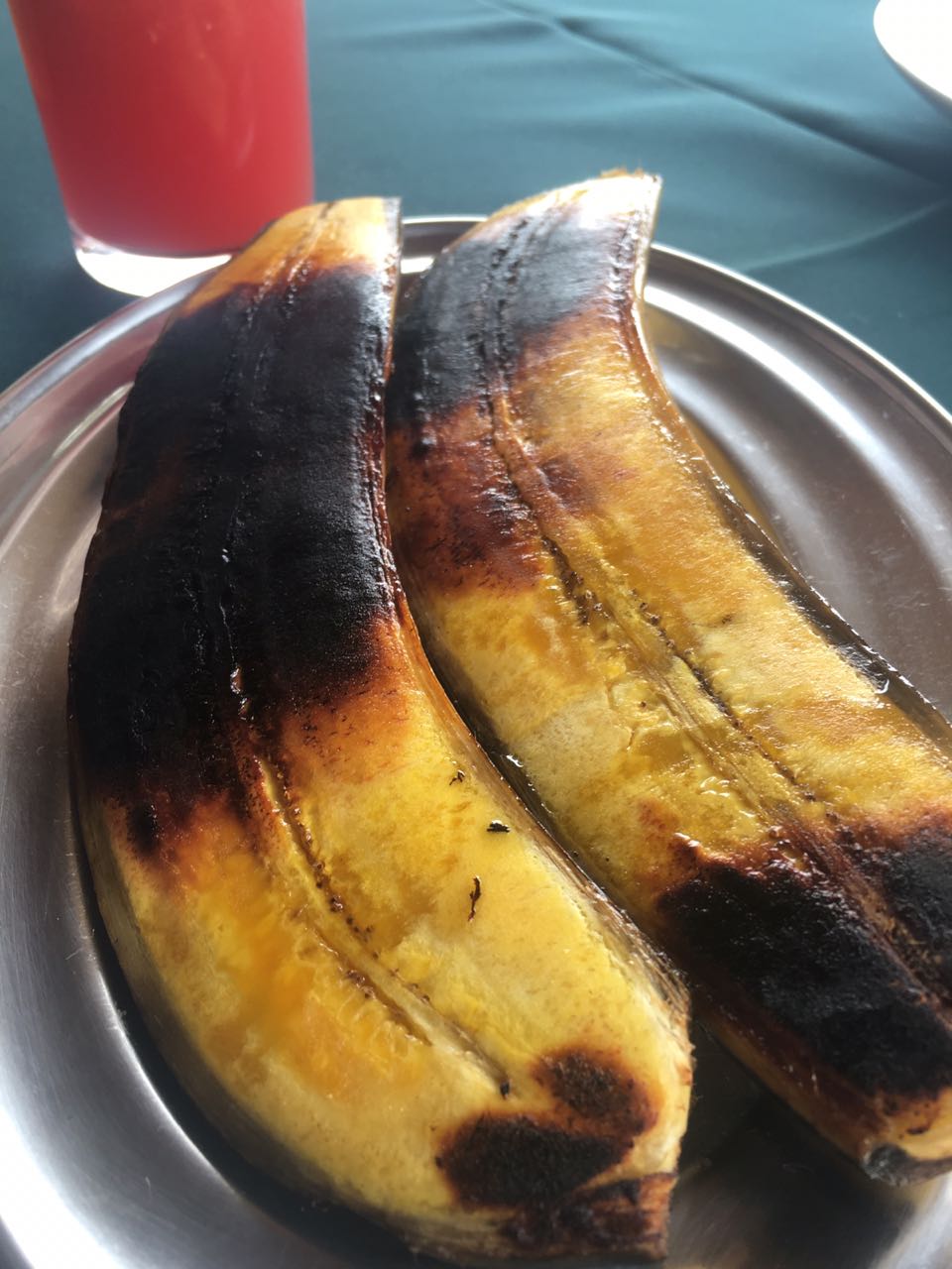 Vegetarianos e veganos encontram delícias na mesa gigante como a banana da terra preparada de várias formas, inclusive na churrasqueira, saladas e pastelzinho de queijo feito na hora.