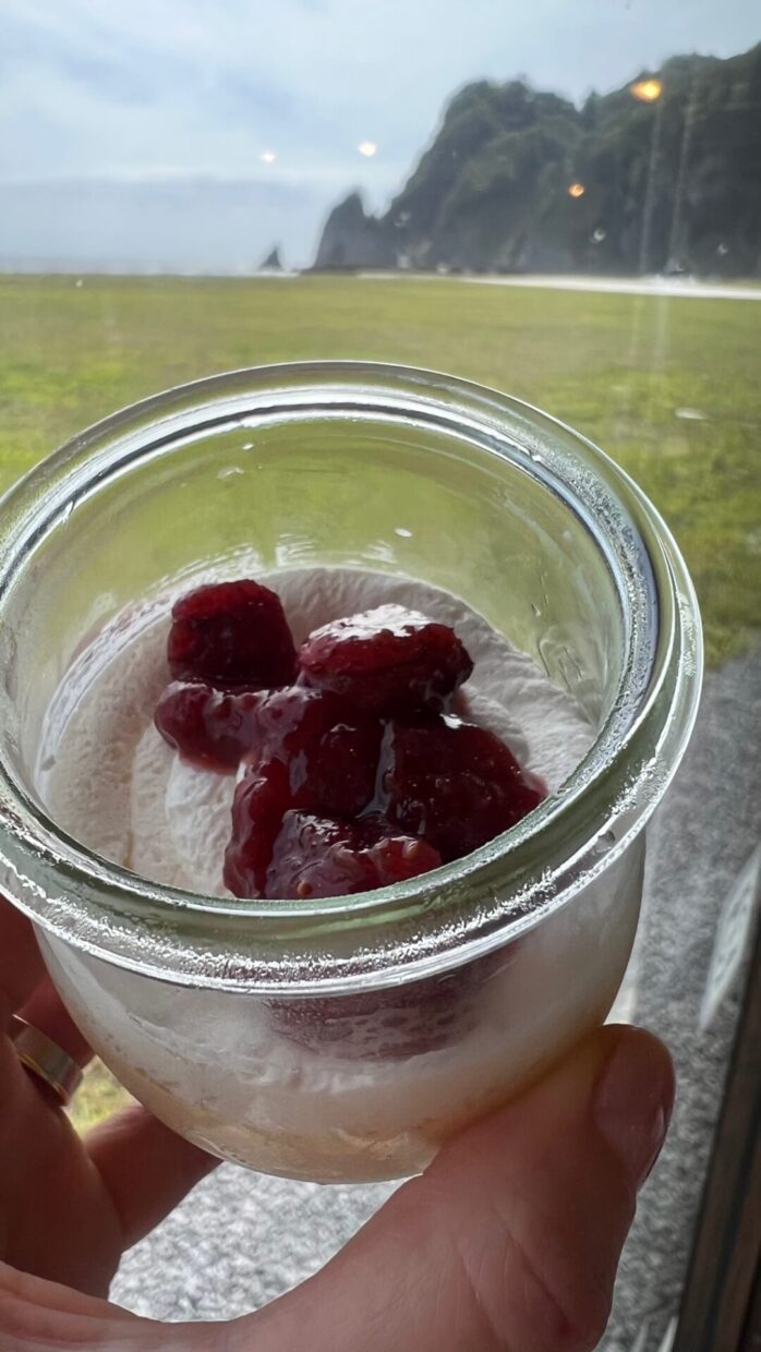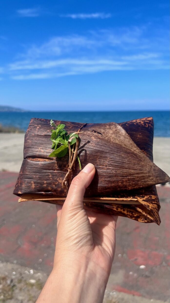 Lanche vegetariano (bolinhos de arroz com verduras) vindo de pequenos produtores, sem uso de embalagem plástica, servido em picnic à beira do Mar do Japão, em Hokkaido – foto: Andrea Miramontes @ladobviagem